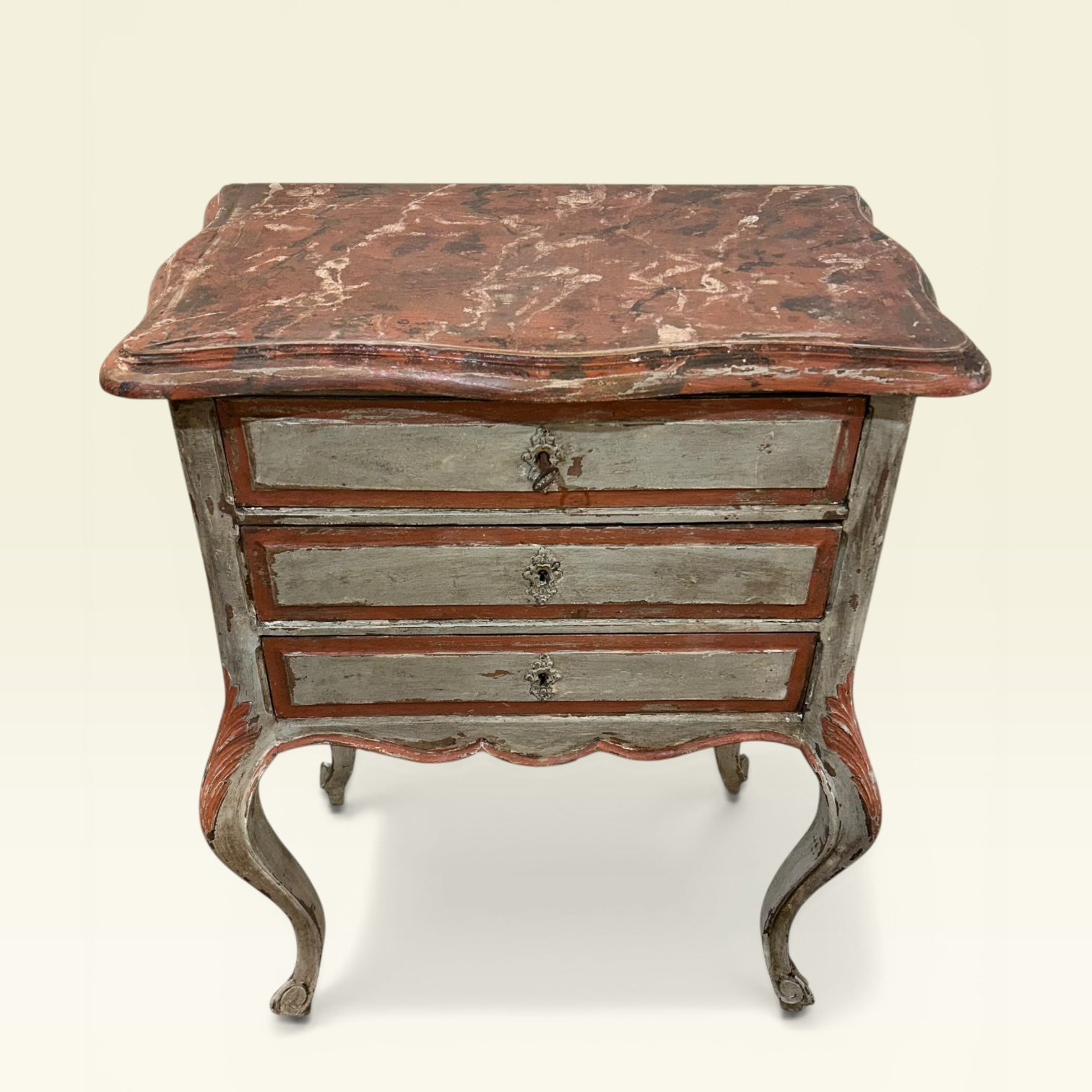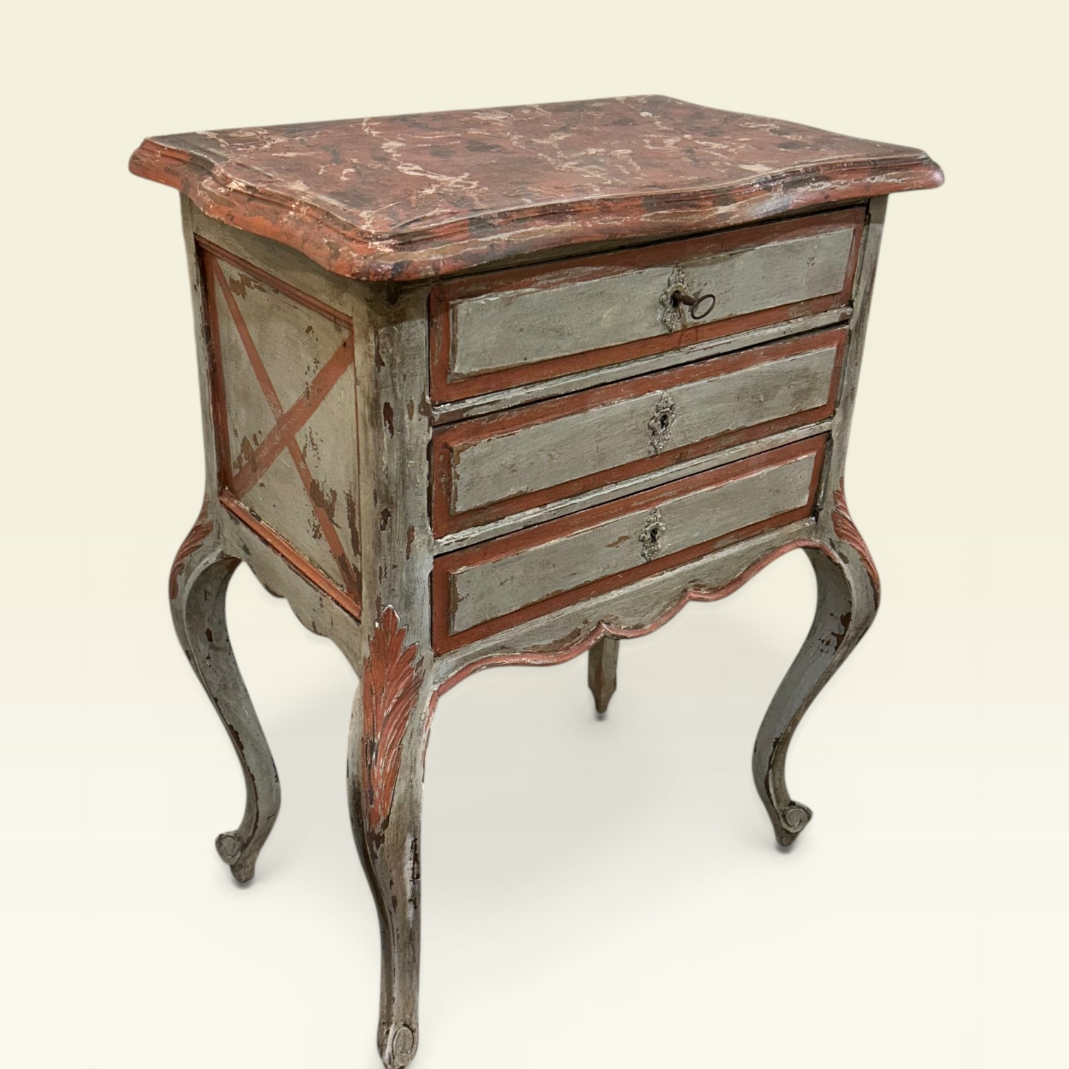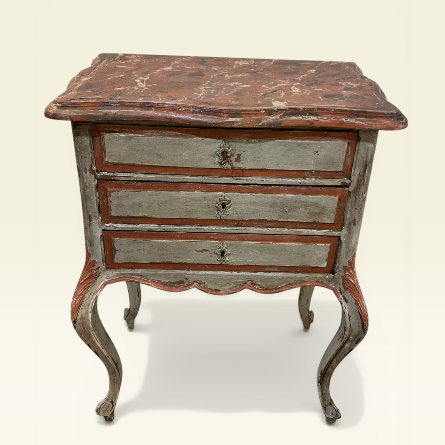 Magnífica pieza de mobiliario con dimensiones muy particulares y una decoración totalmente única. Combina el color verde eucalipto y grisáceo con un tono teja muy especial. El sobre se encuentra policromado original a la época con el típico «trampantojo italiano» que simula el efecto del mármol.