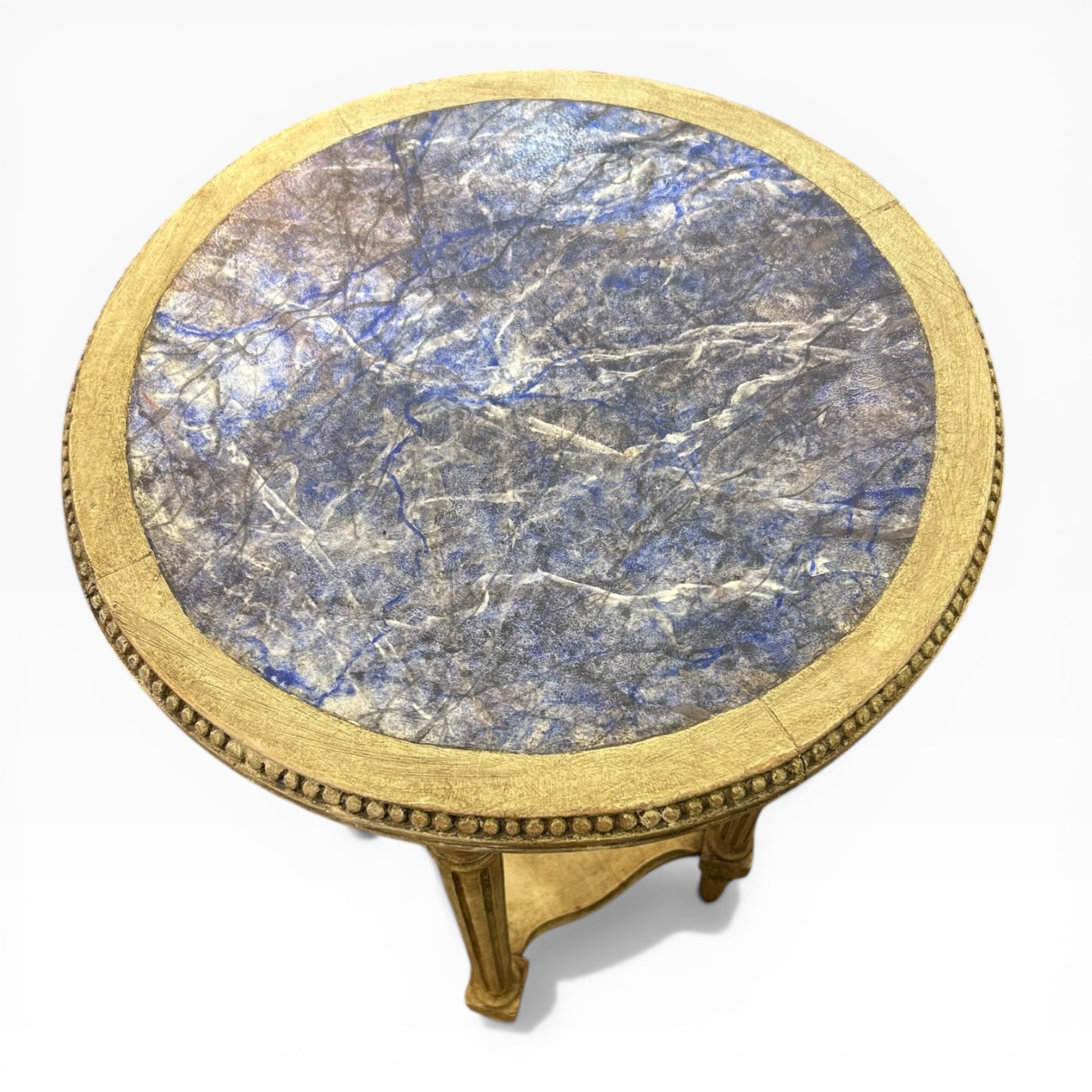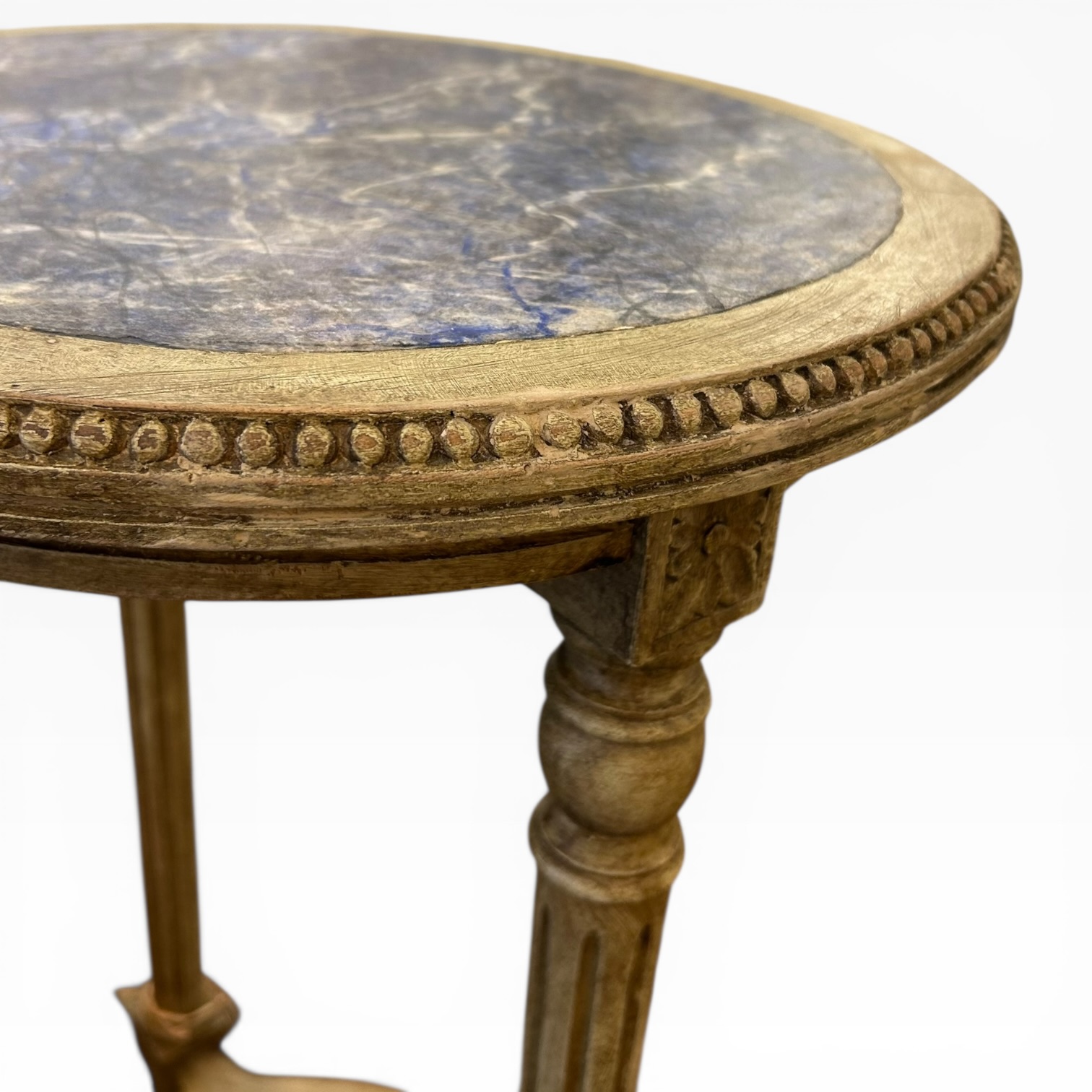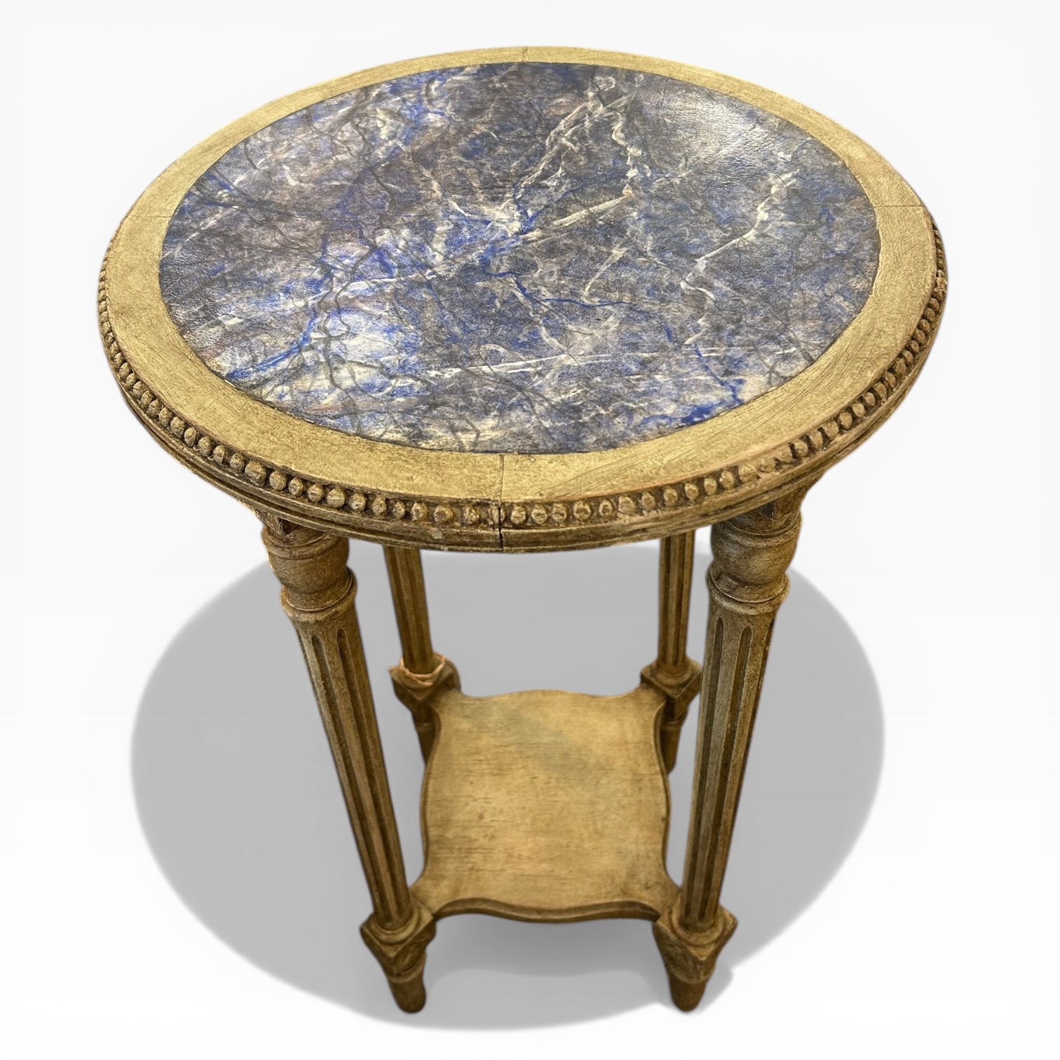 Velador francés antiguo Luis XVI. Policromía superior símil de lapislázuli, con un color intenso y único. Roble decapado con finas patas acanaladas rematadas con decoración vegetal. Perfecta para un rincón de lectura o al lado de los sillones del living room.