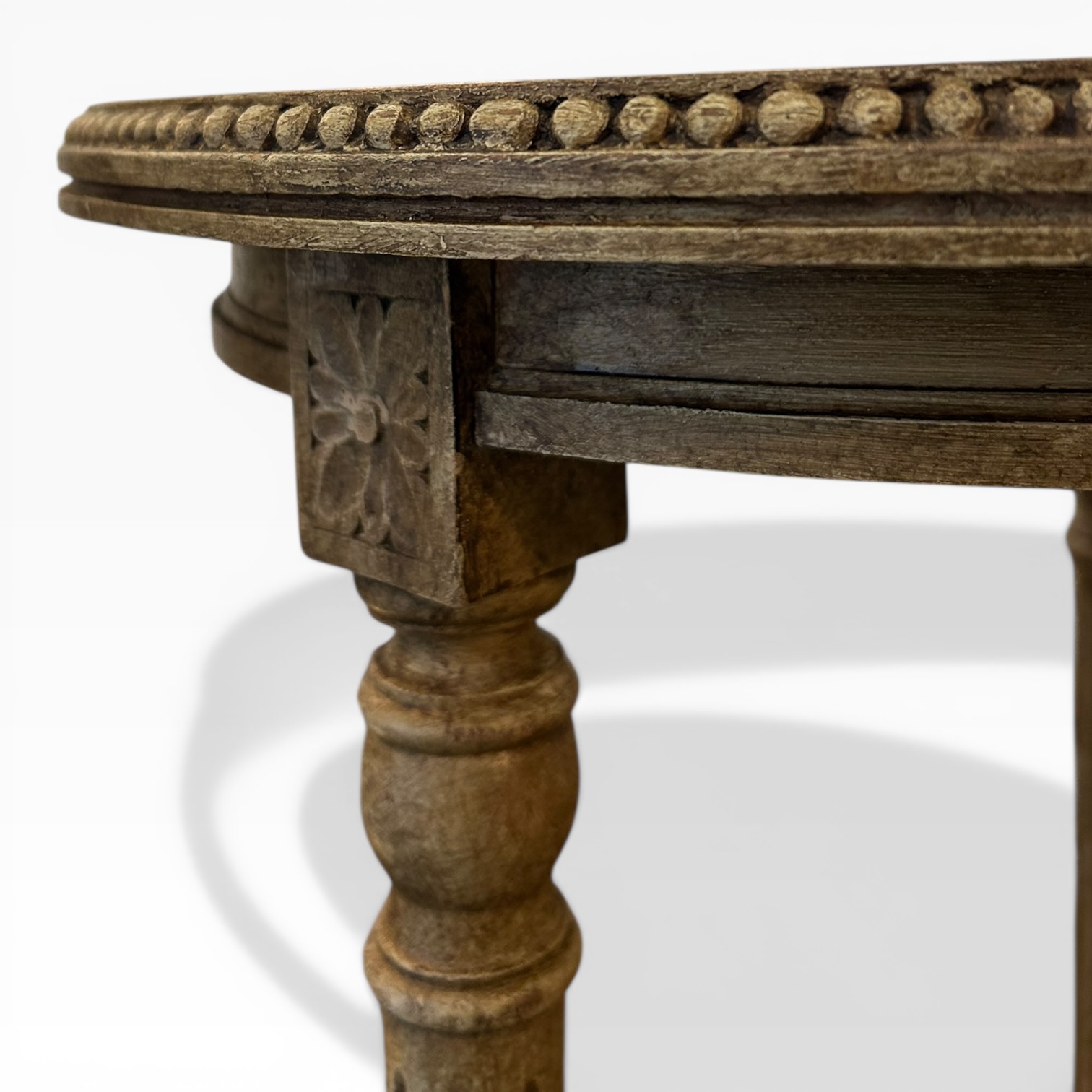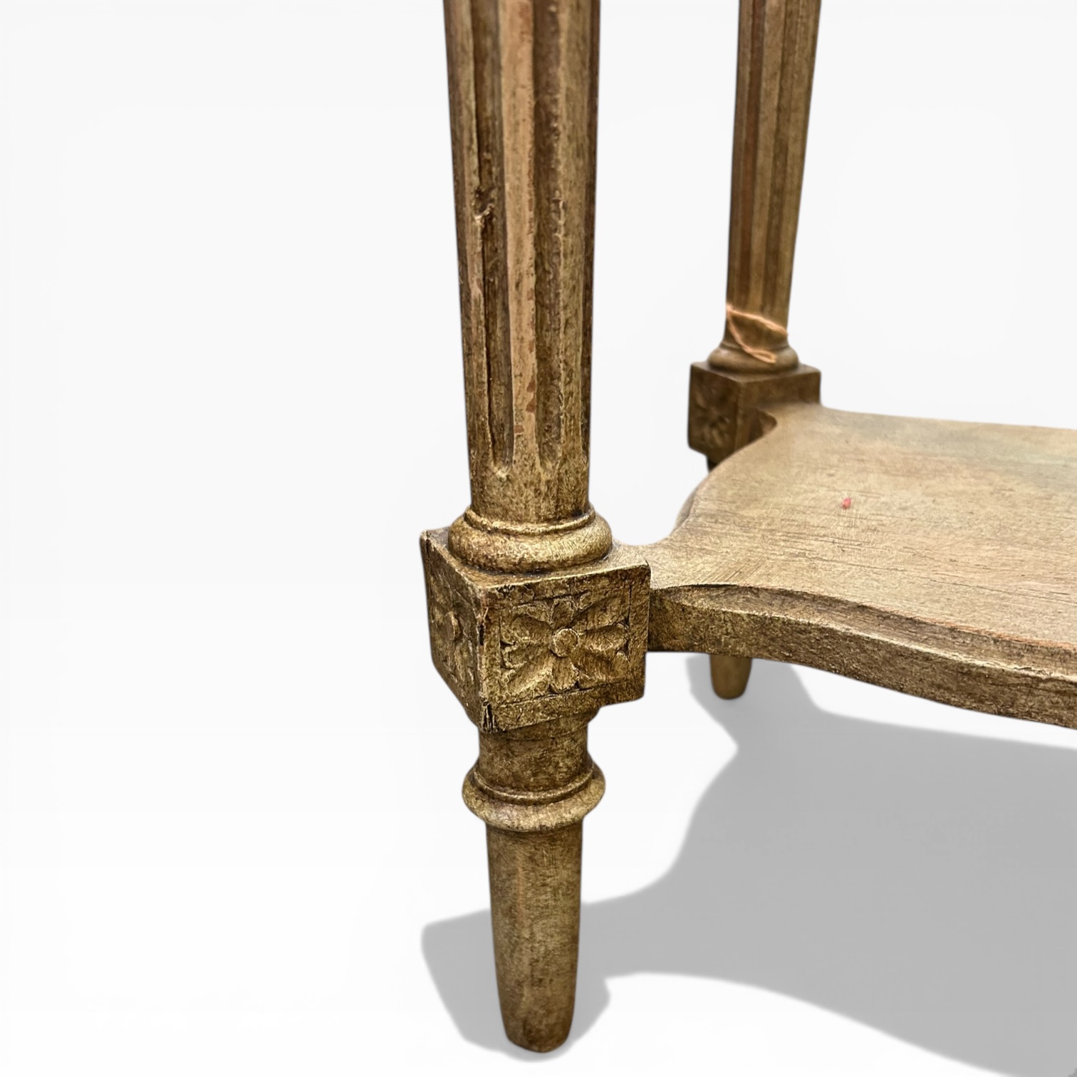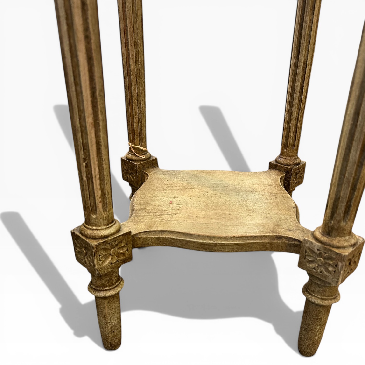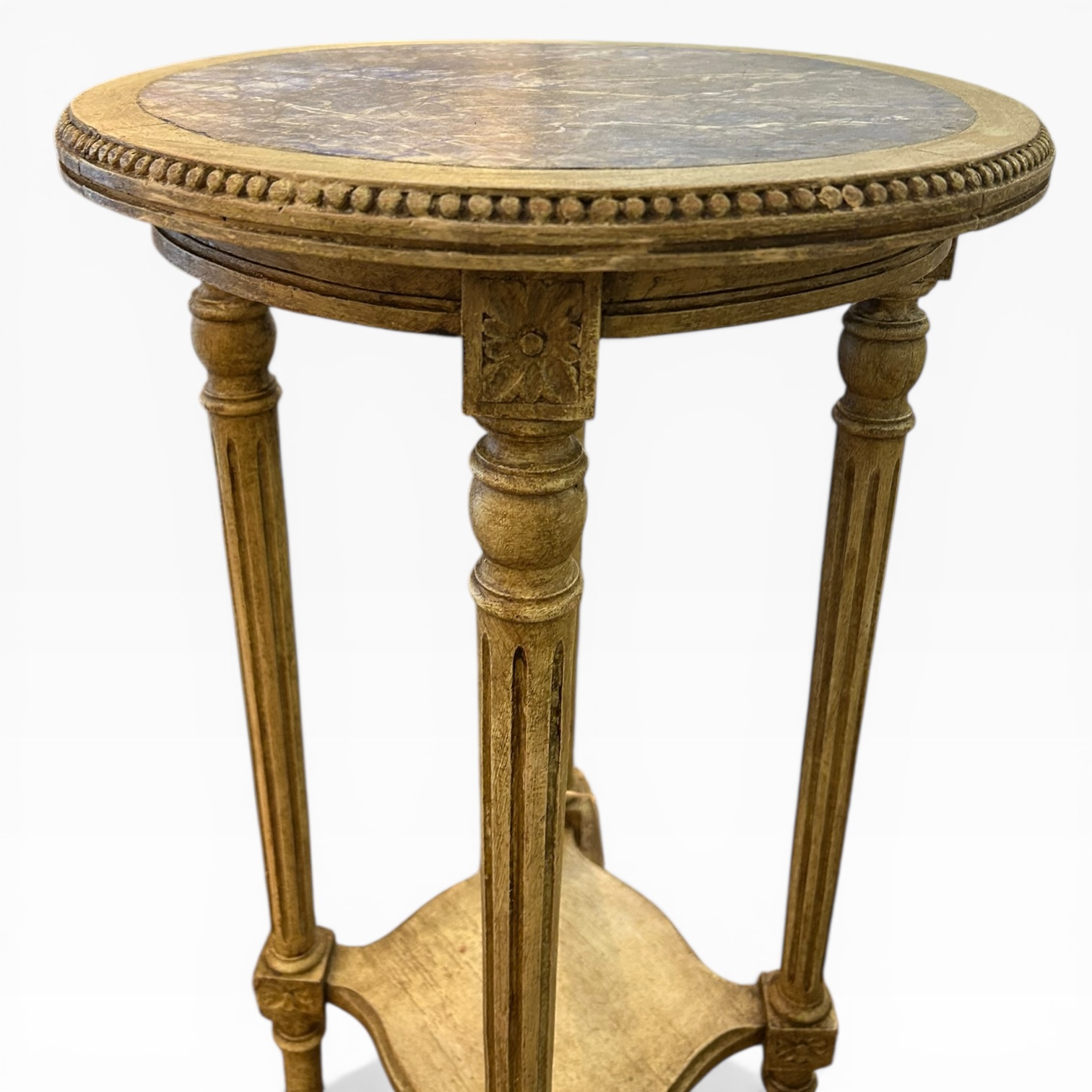 Velador francés antiguo Luis XVI. Policromía superior símil de lapislázuli, con un color intenso y único. Roble decapado con finas patas acanaladas rematadas con decoración vegetal. Perfecta para un rincón de lectura o al lado de los sillones del living room.